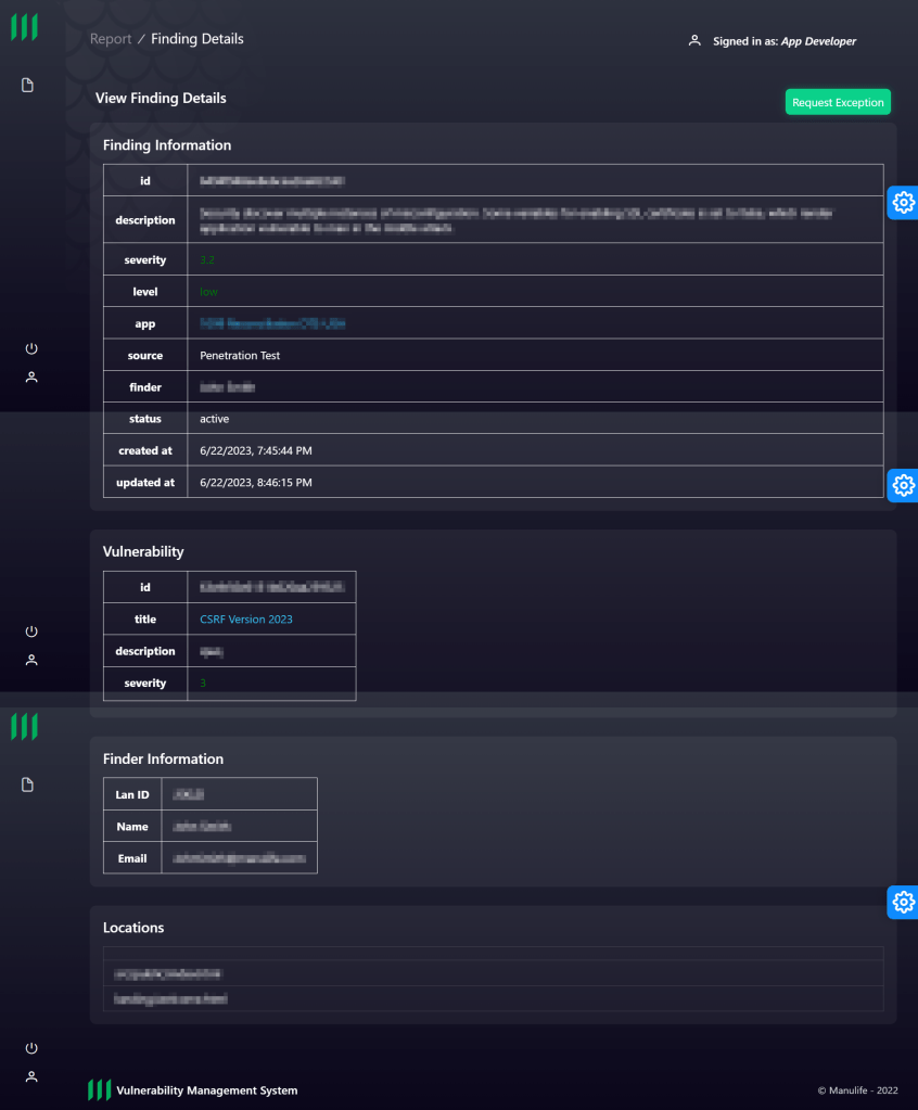 An internal vulnerability dashboard aimed at empowering developers to understand, remediate, and remove vulnerabilities affecting their applications. The application ingests information from internal microservices and other security APIs, in order to consolidate all data in one place. Served as UX lead and engineer, interfacing with development teams to understand their needs and working with the team to update page layouts and functionality to ensure maximum usability.
