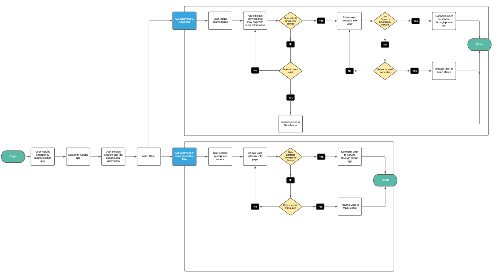After that, I worked on the user journey flowchart. My goal was to design a streamlined system that didn’t get in the way of the user trying to contact a service considering they will probably in an emergency scenario.