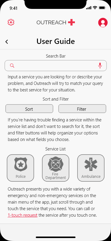Looking back, I feel like this app could benefit from some of the new technologies that are becoming prominent now in. A chatbot that the user can interact with to describe their issue and then get a recommendation based on what they typed in would be so helping while using Outreach, since a user may not know which service to contact depending on their current situation. It might add sometime to getting the user connected to the emergency service that they need, but I think it would be a great addition to this prototype.